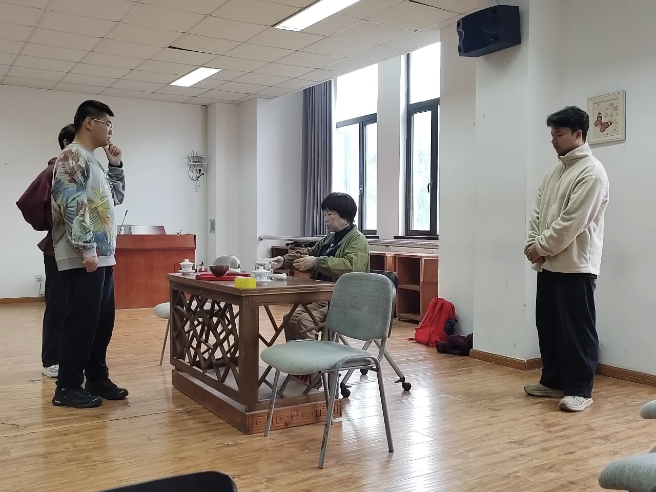 排练期间,王旭烽教授多次亲临现场悉心指导,从角色内心剖析到茶文化精神内核解读,从台词节奏把控到舞台仪态规范,手把手为学子们抠细节、传经验,确保演绎动作与台词能精准传递茶人精神。我院新晋教师李彦雯博士担任执行导演,以专业的戏剧创作与传播素养统筹舞台呈现;专业经验丰富的茶文化资深老师包小慧博士担任艺术指导,从美学设计与表演质感上严格把关,几位主创联手,为话剧品质筑牢根基。